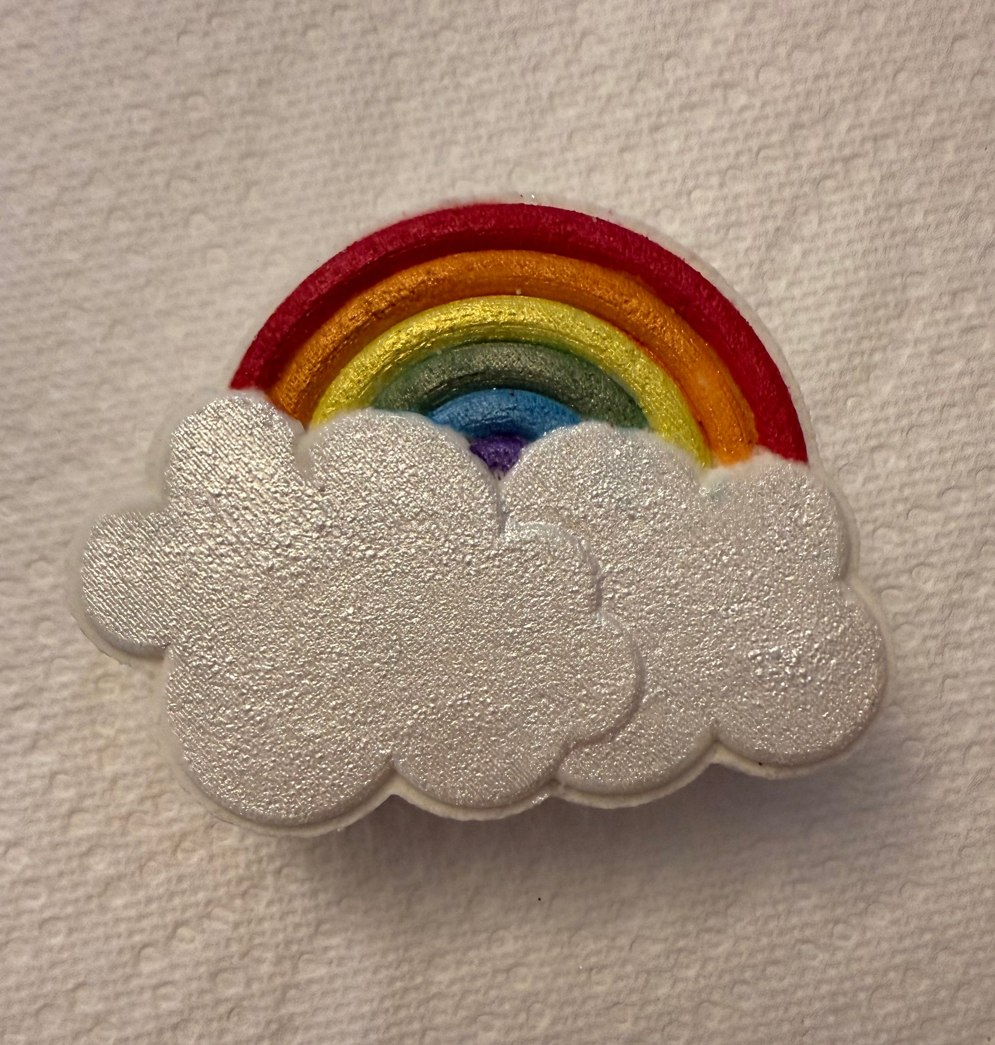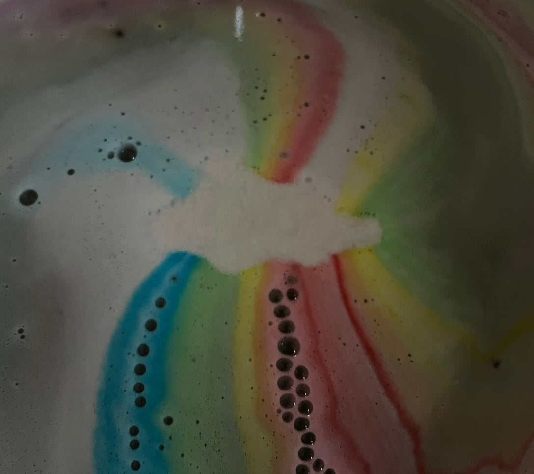 These bath bombs are scented with a sweet fruity scent and both have rainbow embed inside of them.